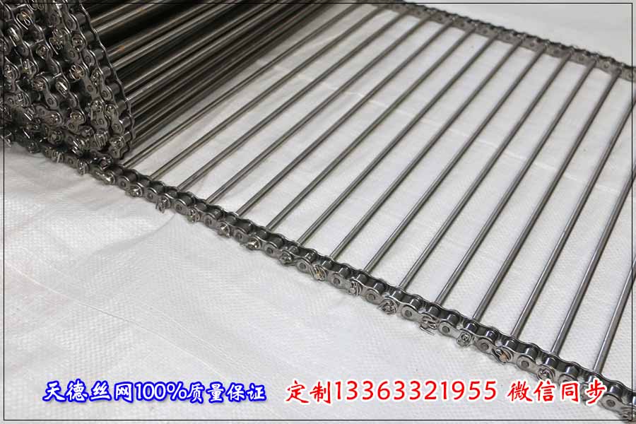 鏈桿輸送帶可采用碳鋼、不銹鋼201/304/316不銹鋼材料,以鏈條傳動,鏈條可選用標準鏈條和雙節距輸送鏈條使網帶受力減小容易安裝網帶的附屬配件,如擋板,側翼,用于輸送固體物料,通透性好,易清洗. 旋的繞絲串起來形成平衡編織的輸送網,螺距3毫米,每1米寬網帶有333個圈。節距6毫米,每1米網帶長有166根曲軸。 該網帶通常網絲是圓的,但也可以制作成扁絲的。材料可選碳鋼、201不銹鋼、304不銹鋼、316不銹鋼等。