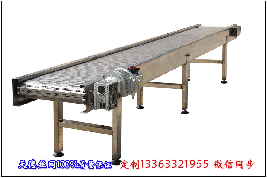 糖果包裝線金屬輸送帶我們采用什么形式什么規格的比較合適呢,這是昨天晚上10點客戶咨詢輸送糖果采用什么形式的金屬輸送帶比較好,我們詳細的問了客戶那邊的情況,客戶說用來輸送散糖到下一道工序進行裝袋子,然后裝箱子。單塊糖包裝好以后面積大概為4*6公分左右,要求載重一米上面在40公斤左右,根據這些要求應該配合使用哪種輸送帶比較合適。聽完這些后我們天德絲網給客戶介紹了一款板式輸送帶,這款板式輸送帶根據客戶不銹鋼輸送機的要求寬度定在了580毫米,輸送機長度在15米,因此輸送鏈板的長度就會是30米,板厚為1.2毫米,鏈節距為31.75毫米,穿桿直徑為6毫米,輸送鏈板表面打孔用來透氣,打孔直徑為3毫米。鏈板輸送機高度為500毫米,采用1.5千瓦點擊配帶變頻器。