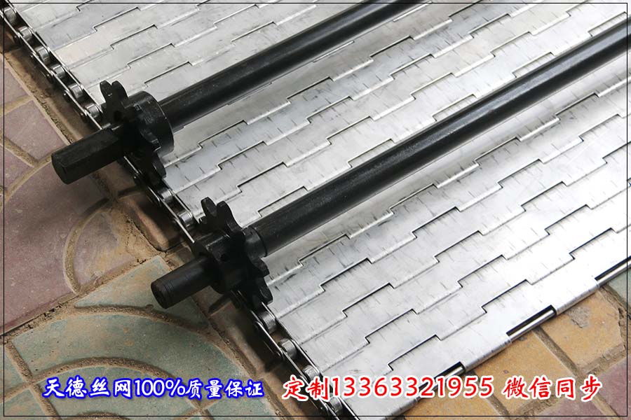 2.板式不銹鋼網帶總寬度為1500毫米,長度為8米,鏈板 的厚度為1毫米,鏈板表面打孔為3毫米,鏈條節距為50.8毫米,傳桿直徑為8毫米,每間隔200毫米左右加2排拖輪,加拖輪的鏈板片不打 孔。不銹鋼輸送帶表面隔板高度為30毫米,隔板之間的距離為200毫米左右。 希望我的提供能給大家帶來幫助。