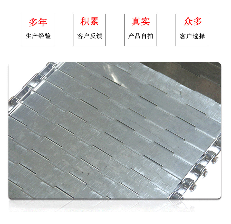 鏈板輸送帶:是采用不銹鋼板沖壓成型,鏈條傳動,每節由6-10mm支撐桿連接,其運動平穩、力量大,適合用于輸送細小的高密度物件,輸送過程中運轉平穩,安裝更換方便,成本高,使用壽命較長。