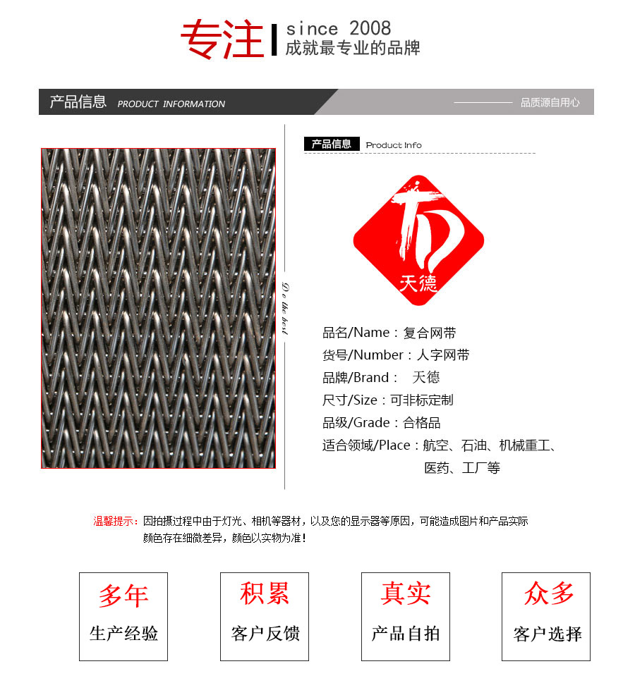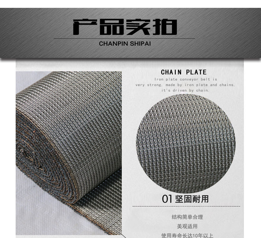 人字形網帶應用:主要應用于食品烘干機、蔬菜、海產品清洗機,巴氏機,方便面米粉蒸煮、熱收縮膜包裝機。玻璃瓶罐、食品、燈炮、金屬、器皿、化纖、印染、醫藥、電子、粉末冶金、熱處理、木材、物流輸送等各行業自動裝置和自動流水線的使用;焦爐煤氣及電子紅外線等各種窯爐系統的傳動使用等食品機械,玻璃機械,輸送機械。