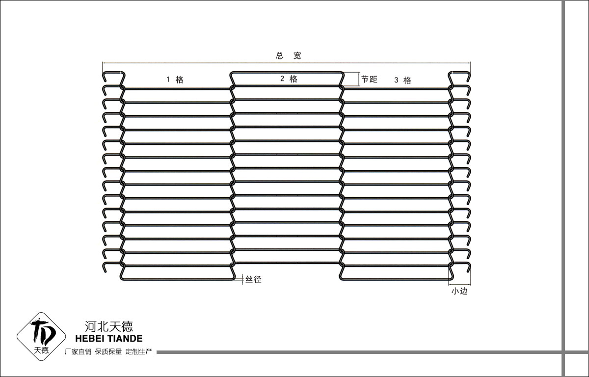 乙字網(wǎng)帶使用不銹鋼高彈柔韌絲制作。網(wǎng)帶多用單小邊結(jié)構(gòu)(常用),雙小邊結(jié)構(gòu)用于特殊用途。可以用于直線輸送機,也可以用于轉(zhuǎn)彎輸送機。