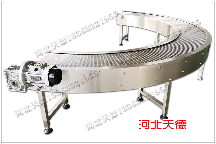 轉(zhuǎn)彎角度為180度,客戶要兩端與直線網(wǎng)帶輸送機進行銜接組成流水線,用來輸送小箱子,整條輸送線平穩(wěn),這臺轉(zhuǎn)彎機整機采用不銹鋼304材質(zhì)的材料加工的。