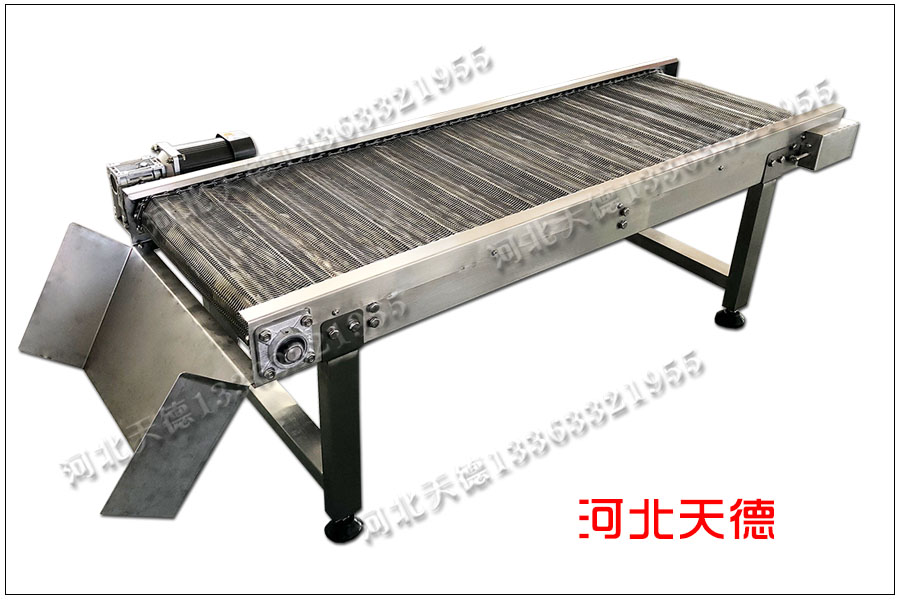 整臺輸送機采用不銹鋼304材質(zhì)加工,輸送機機架厚度為3毫米,金屬輸送帶鋼絲編織鏈條輸送帶來傳送物料。