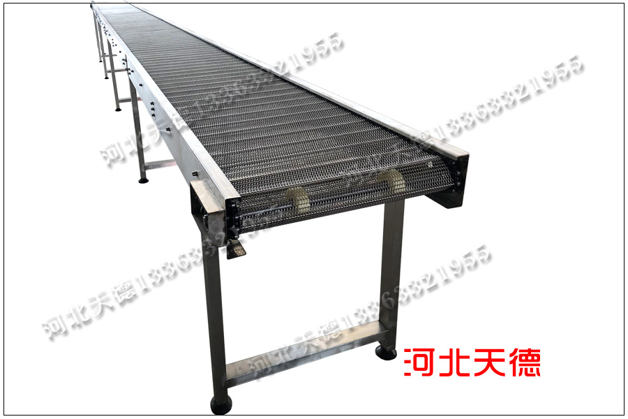 這臺輸送機的總長度為8米,總寬度為60公分,高度為70公分,不銹鋼304材質。采用鏈條輸送帶輸送,輸送帶寬度為55公分,長度為16.5米,鏈條節(jié)距為38.1毫米,桿直徑為8毫米,間距為150毫米左右。絲徑為1.8毫米,孔徑為15*20毫米。采用耐高溫不銹鋼304材質。